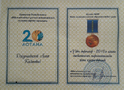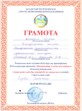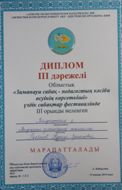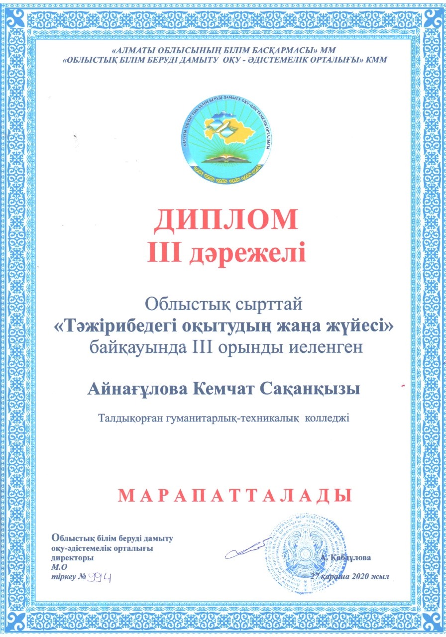 - 2020 ж. «Тәжірибедегі оқытудың жаңа жүйесі» жалпы білім беретін оқытушылар облыстық байқауы ІІІ орын; |
