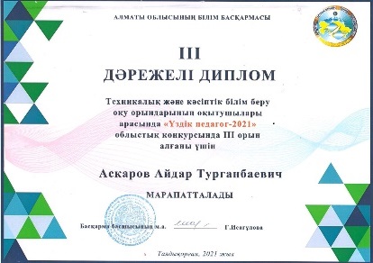 - Техникалық және кәсіптік білім беру оқу орындарының қытушылары арасында «Үздік педагог-2021» облыстық конкурсында III орынды Асқаров Айдар иеленді |