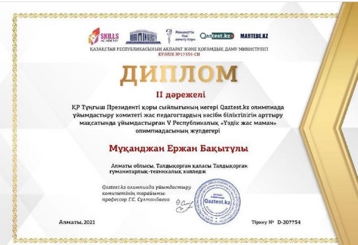 - Республикалық «Үздік жас маман» олимпиадасына колледжіміздің өндірістік оқыту шебері Мұқанджан Ержан қатысып, ІІ дәрежелідипломмен марапатталды. |