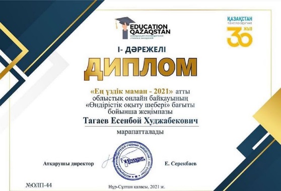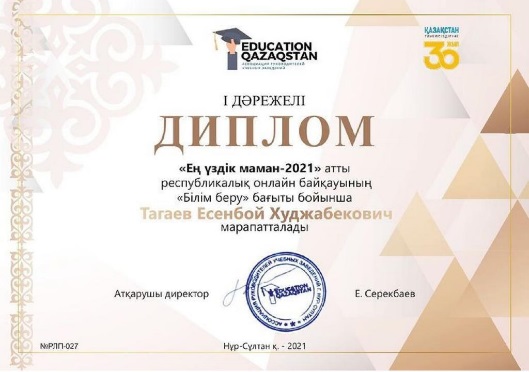 - «Ең үздік маман – 2021» атты республикалық байқауың «Білім беру» бағыты бойынша жеңмпазы Е.Тагаев марапатталды. |