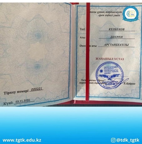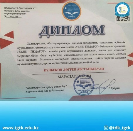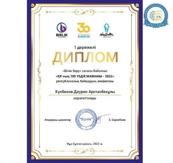 - «Білім беру» саласы бойынша «ҚР – ның 100 үздік маманы – 2022» республикалық байдаудың жеңімпазы колледжіміздің өндірісітік оқыту шебері Д.Кульбеков |