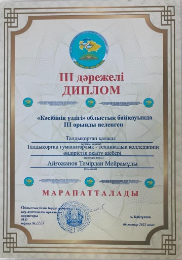 - Облыстық «Кәсібінің үздігі - 2022» атты байқауда өндірістік оқыту шебері Т.Айғожанов жүлделі ІІІ орын иеленді. |