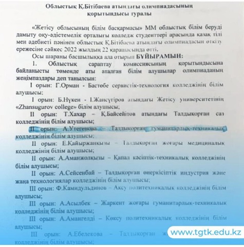 - Облыстық Қ.Бітібаев атындағы олимпиадасына колледжіміздің 313-топ студенті Утегенова Ақмаржан қатысып, жүлделі ІІ орын иеленді, студенттің қабілетін шыңдап, олимпиадаға қатысуына бағыт – бағдар көрсетіп, жетекшілік еткен қазақ тілі мен әдебиеті пәнінің оқытушысы Ж.Жунусова алғыс хатпен марапатталды. |