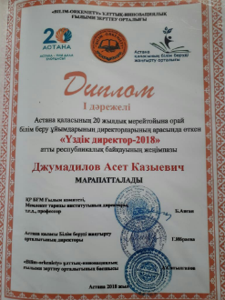 - 2018 жыл «Үздік директор - 2018» республикалық байқауының жеңімпазы колледж директоры Джумадилов Әсет Қазыйұлы І дәрежелі дипломмен және білім саласына қосқан айрықша еңбегі үшін «Үздік директор - 2018» төсбелгісімен марапатталды. |