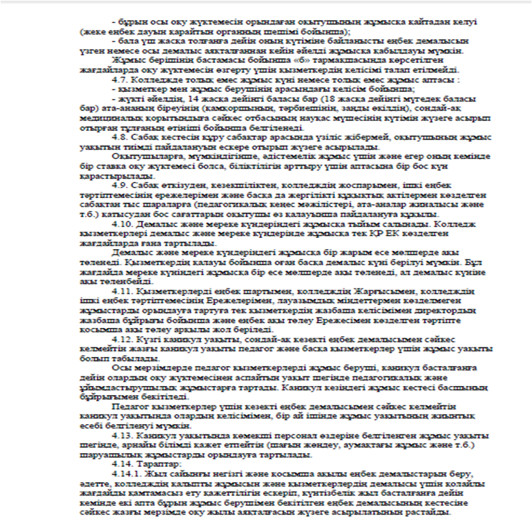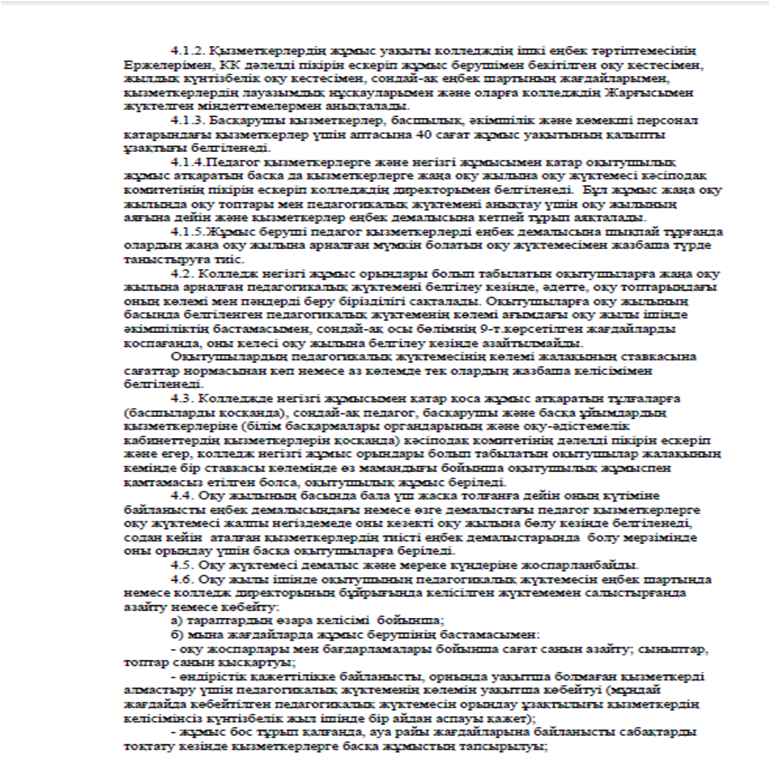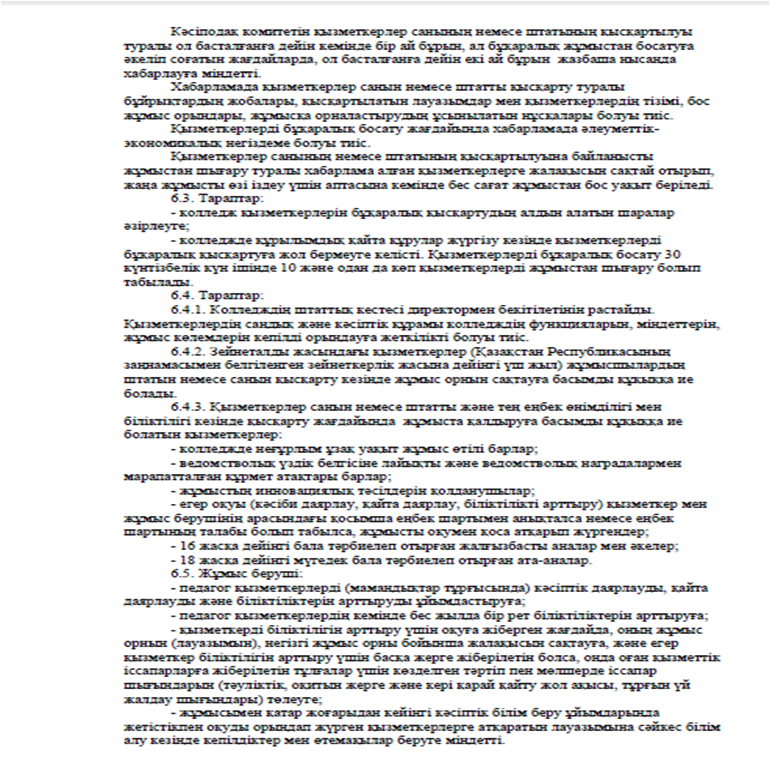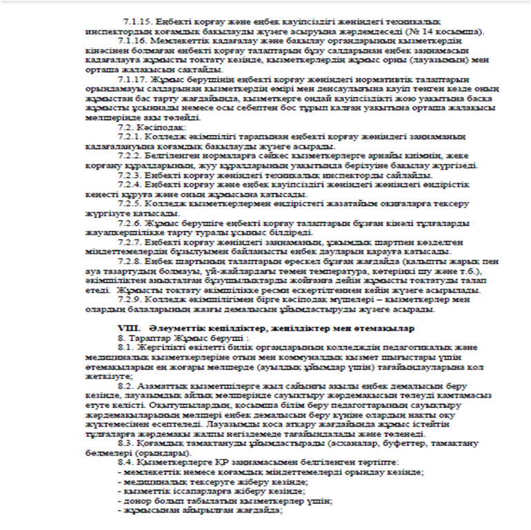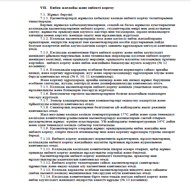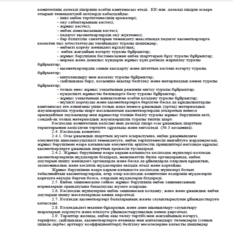 Кәсіподақ комитеті жұмысының басты міндеті колледж қызметкерлері мен студенттерінің еңбек және әлеуметтік-экономикалық құқықтары мен мүдделерін қорғау болып табылады. Кәсіподақ ұйымы ҚР Конституциясы, Еңбек Кодексі мен ҚР «Кәсіподақтары туралы» Заң негізінде өз қызметін іске асырып келеді.