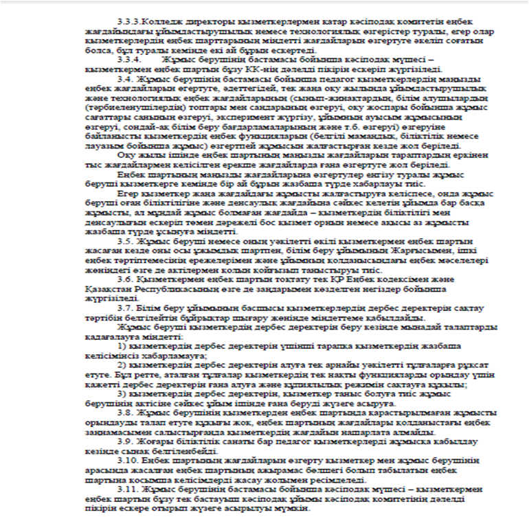 Колледж кәсіподақ комитетінің құрамында 7 адам бар, олардың әрқайсысы өзіне бекітілген сектор жұмысына жауапты. Кәсіподақ комитетінің мүшелері өздерінің қызметтерінде қызметкерлер мен студенттерді кәсіподақ қатарына тартудың инновациялық түрлері мен әдістерін белсенді қолданады. Жылдық жұмыс жоспары негізінде кәсіподақ комитеті ұжымдық шарттағы шарттардың орындалуын бақылайды, оны іске асыру, еңбекті қорғау және қауіпсіздік ережесінің жағдайы, еңбекақы төлеу, шәкіртақы және еңбекке жарамсыздық қағазы бойынша ереже, жинақтаушы қорларға зейнетақылық салымдарды жіберу жолындағы колледж әкімшілігі мен кәсіподақ комитетінің есебі тыңдалады. Кәсіподақ комитеті колледж оқытушыларын аттестаттауға, еңбек демалысының кестесін келісуге, тарификациялау жұмыстарына қатысады. Колледждің кәсіподақ ұйымы кәсіподақ ұйымы мүшелерінің жазғы уақытта сауықтырылғанына көп көңіл бөледі.