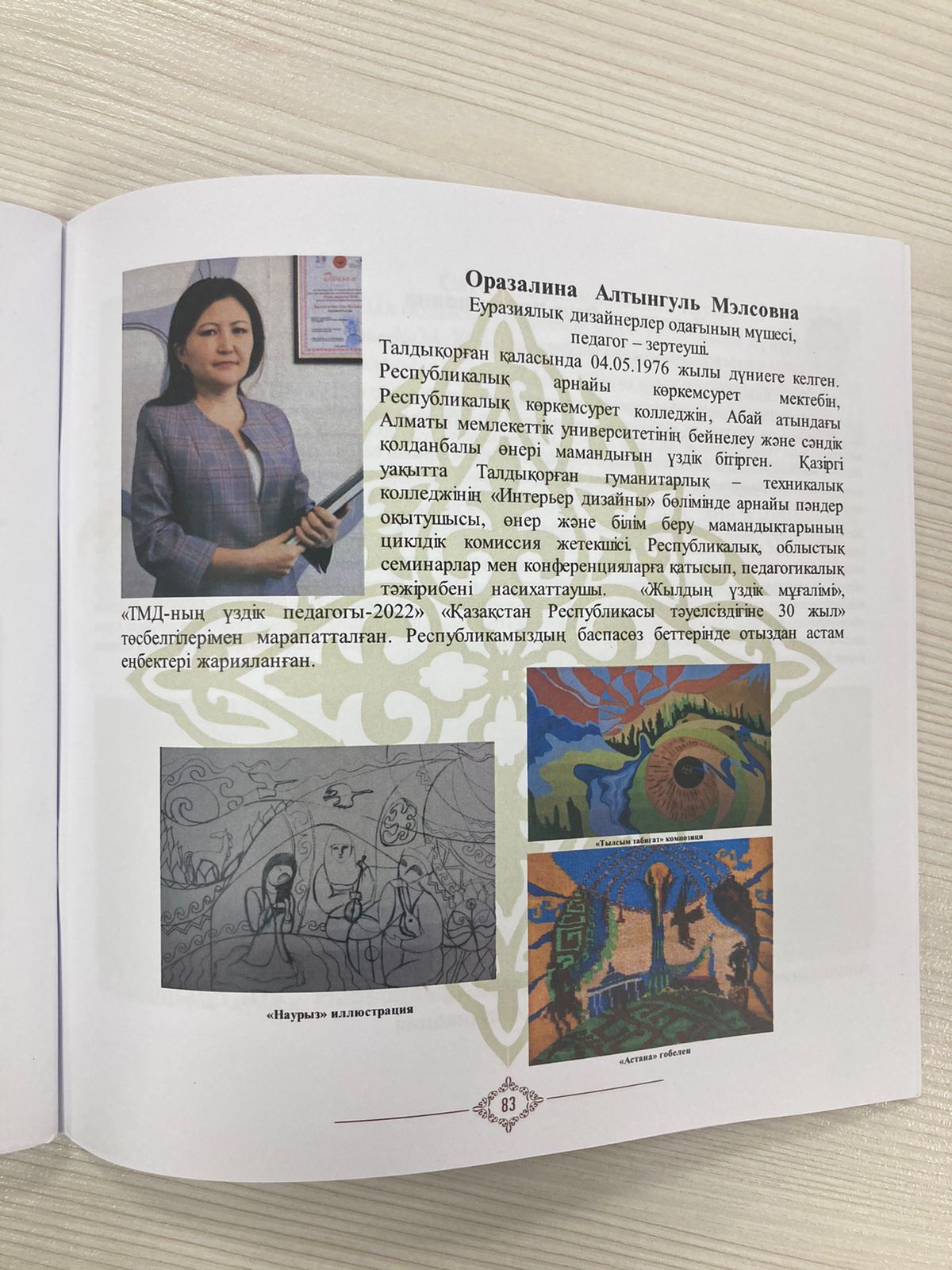 Мамыр айында Мемлекет басшысы Қасым-Жомарт Тоқаевтың биылғы жылды «Балалар жылы» деп жариялауына байланысты Республикамыздың қолөнер шеберлері, кәсіби суретшілері мен көркем еңбек педагогтары арасындағы "Ұрпақтар сабақтастығы" атты Республикалық СИМПОЗИУМҒА колледжіміздің ө\о шебері А.Оразалина қатысты. Білім беру және "Қазақстанның Педагогикалық Академиясы" корпоративтік қорының ұйымдастыруымен өткізілетін бұл іс-шарада симпозиумға қатысушылар пленэрге шығып, көрме ұйымдастырып, шеберлік сағаттар көрсетіп, тәжірибе алмасты. Үздік туындылар каталогқа жинақталып шықты. Бұл каталог өскелең ұрпақтың үйлесімді дамуы мен бақытты балалық шақтарының кепілі шығармашыл ұстаздардың қолдарында екендігін білдіретіндей. Бабалардан қалған мұраны дамытып, ұрпақтан ұрпаққа сабақтастыратын, жоқтан бар, жаудан дос жасай алатын саяси сауатты, рухы биік, білімі терең, өнерлі ұрпақ тәрбиелеу бүкіл халықтық іс.