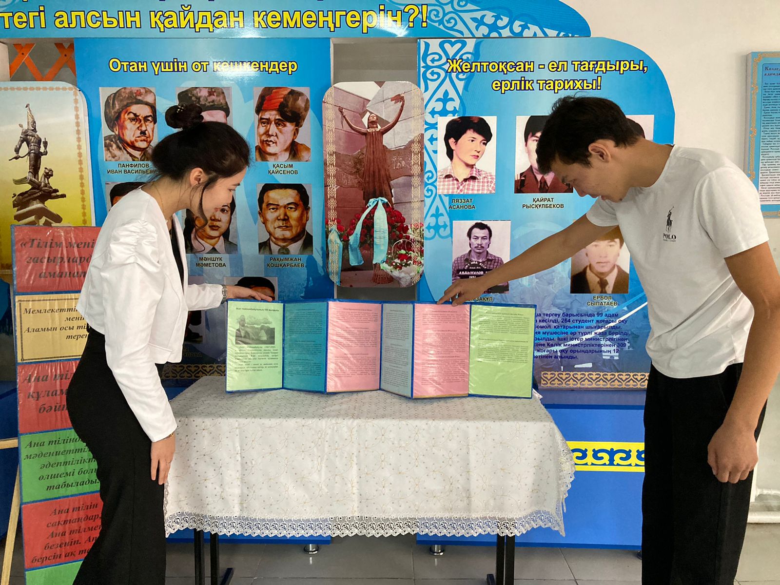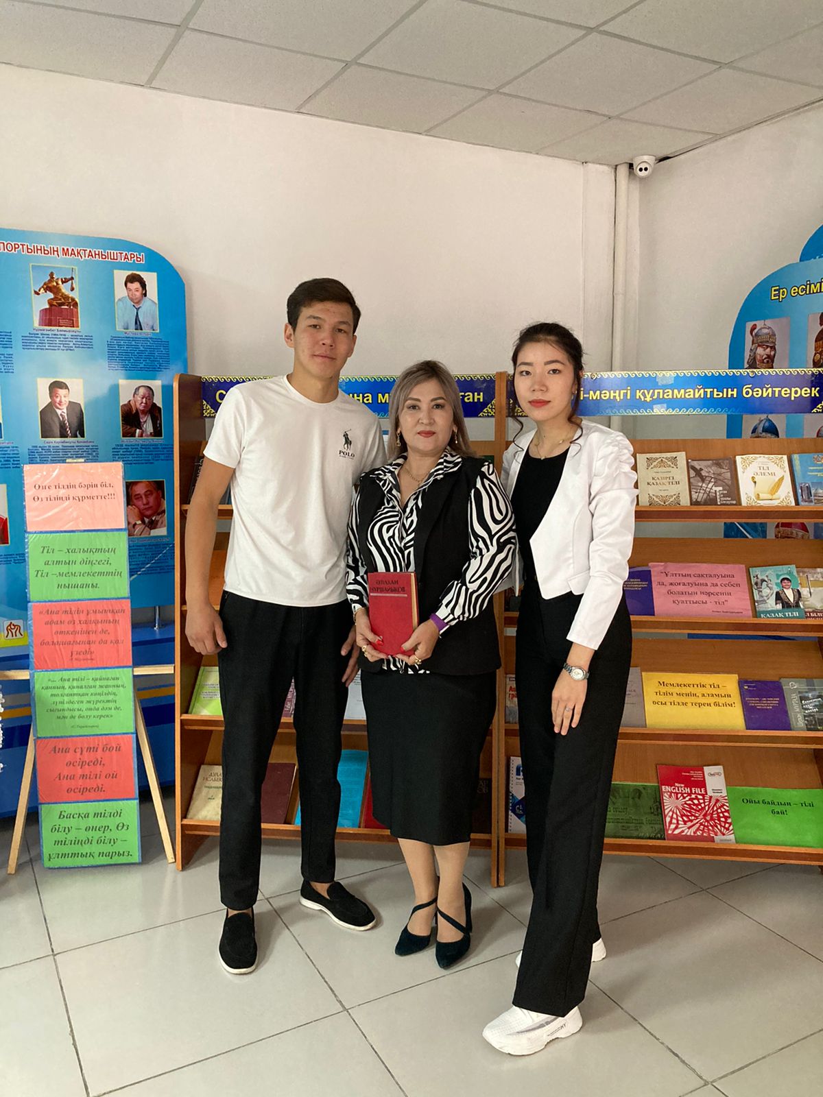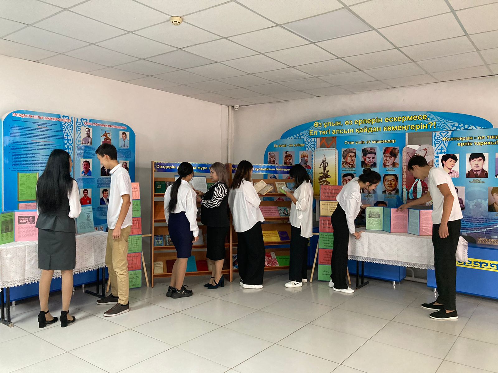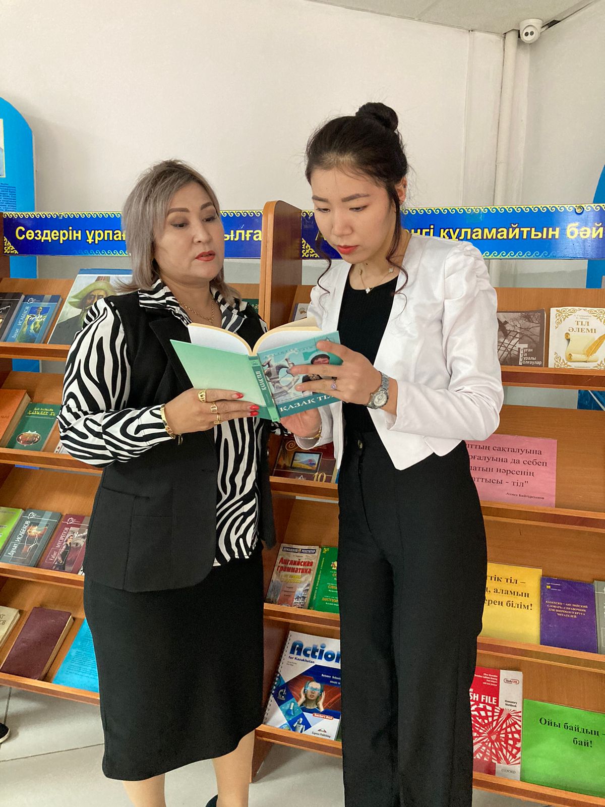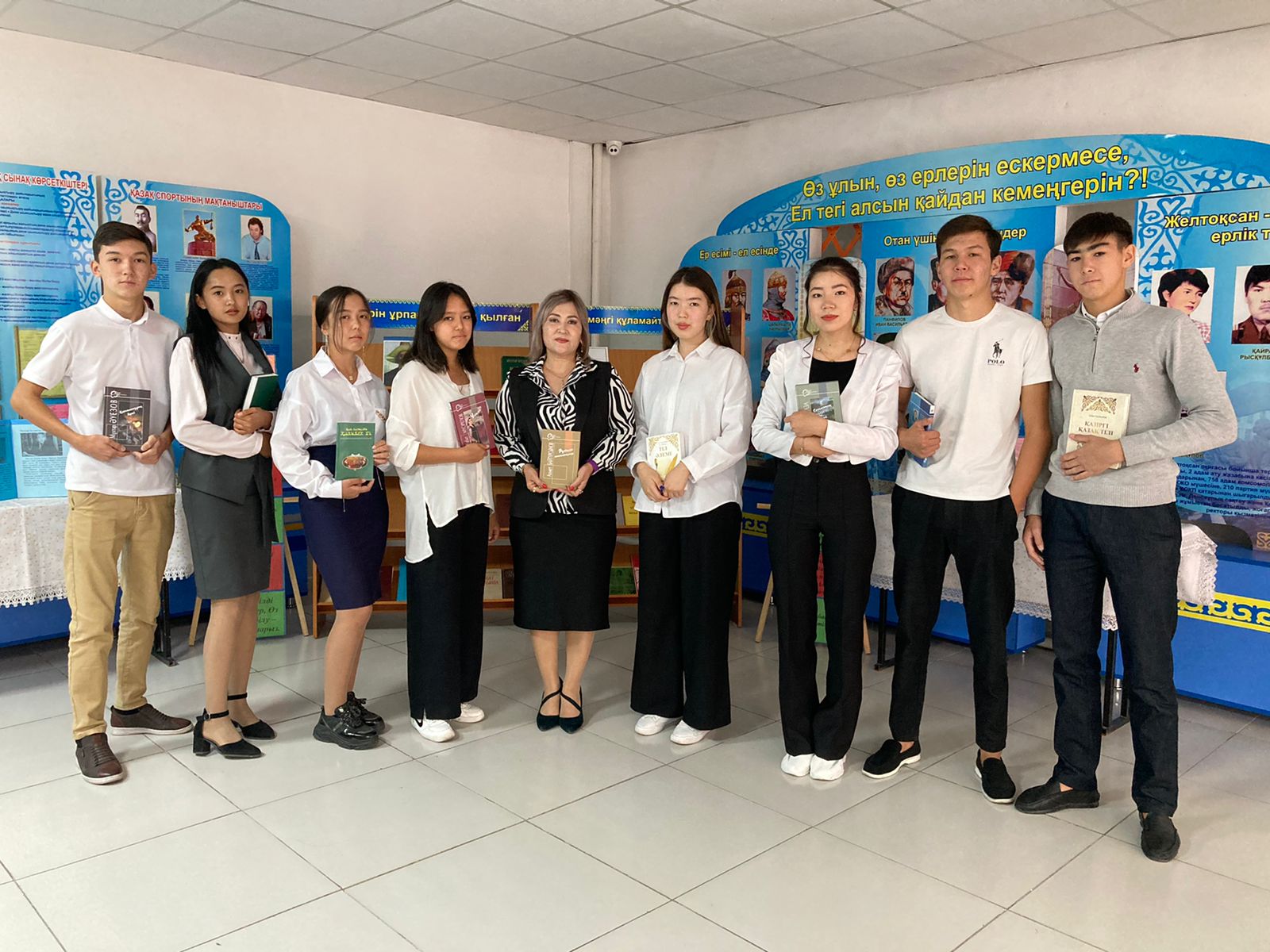 Тілдің мемлекеттік мәртебесін қалыптастыруға, қазақ тілінің қолданылу аясын кеңейтуге бағытталған көрмеге, колледж студенттері белсене қатысты. Кітапханашы оқырманды кітап көрмесімен таныстырып, бірқатар кітаптарға библиографиялық шолу жасады. Ұлт ұстазы, тіл біліміне үлкен үлес қосқан, Латын әліпбиінің негізін қалаушы Ахмет Байтұрсынұлының 150 жылдығына орай, ақынның шығармашылығы мен еңбектеріне баса назар аударып, студенттерге кеңінен мағлұмат беріп өтті.