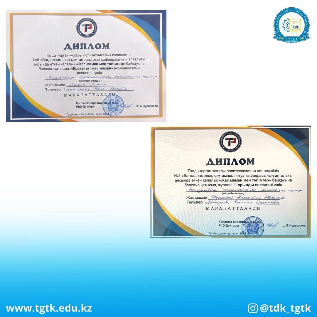 17 қараша күні Талдықорған жоғары политехникалық колледжінің ұйымдастыруымен қалалық «Жас маман мен тәлімгер» байқауы өткізілді.Бұл байқауға колледжімізден жас маман тарих пәнінің оқытушысы Жұмабай Нұрсұлтан, тәлімгері Айнагулова Камшат Сақанқызы және ағылшын тілі пәнінің оқытушысы жас маман Ауесхан Ахниет, тәлімгері Самалбаева Баян Абенқызы қатысып тәжірибе алмасып қайтты.Байқау қорытындысы бойынша Н.Жұмабай жүлделі ІІІ орынды иеленсе, А.Ауесхан «Креативті жас маман» номинациясын жеңіп алды
