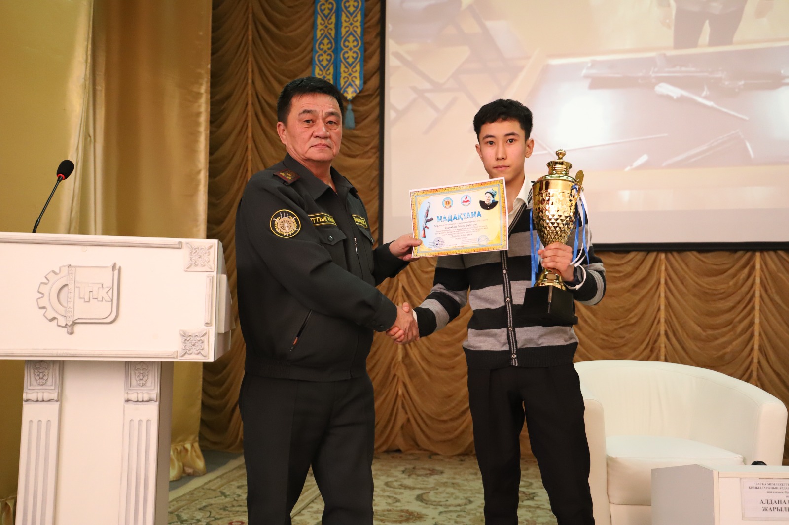 Халық қаһарманы Б.Момышұлының туылғанына 112 жыл орай өткен Республикалық әскери-патриоттық жарысқа Талдықорған гуманитарлық-техникалық колледжінің 2 курс студенті Сыдықбаев Әлішер "Калашников автоматын толық емес бөлшектеу және жинақтаудан» қатысып, жүлделі 2 орын иеленді. Сыдықбаев Әлішерге марапатын тапсыру үшін "Басқа мемлекеттердің аумағындағы ұрыс қимылдарының ардагерлері мен мүгедектерінің" қоғамдық бірлестігінің төрағасы, полковник Алданазаров Ерлан Жарылкасынұлы өзі арнайы келіп құттықтап, жастарға патриоттық тәрбие бойынша әңгіме жүргізіп, жетекшілік еткен колледждің Алғашқы әскери және технологиялық дайындық пәнінің оқытушы-ұйымдастырушысы Шарипов Ерғали Кенжебекұлына «Қазақстан патриоты» төсбелгісін табыстады. Марапаттарыңыз құтты болсын!